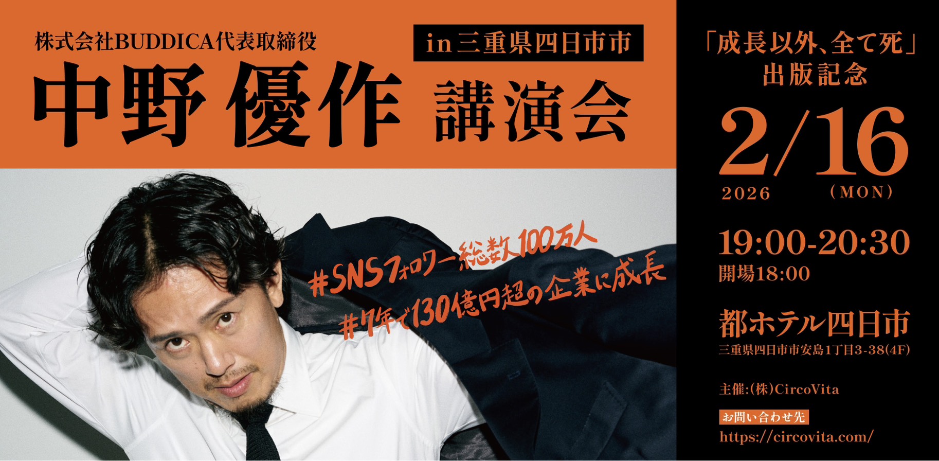 この度、今YouTubeなどで人気の中古車販売(株)BUDDICAを経営する中野優作さんを四日市(三重県)へお招きして、講演会を開催できることになりました。